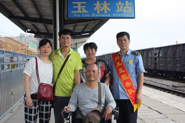 下午两点,唐家英的家人来宾馆接我们,将我们送到了火车站。我在通过安检后,见到一个工作人员向我走来,他所佩戴的锦带写着“刘玉生服务队”。他主动向我打招呼,询问我到什么地方,哪次列车,同行有几个人,都带什么行李,重不重。