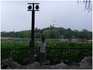 碧绿的荷叶,还有对面的大白塔,衬托着岸堤的翠柳、红墙,原来这就是《让我们荡起双桨》的拍摄地。湖边大片荷花开放,美不胜收。这是我生平第一次见到荷花,不由得让我想起了初中学的课文《爱莲说》。可惜有许多景点我无法欣赏。