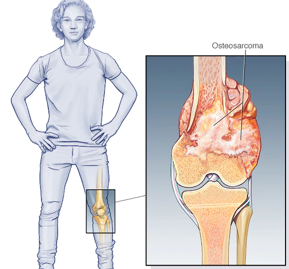骨肉瘤最常出现在长骨中——更常见的是腿,但有时是手臂——但它可以在任何骨头开始,其症状或体征如骨头附近肿胀、骨头或关节疼痛、骨头受伤或骨折却没有明确的原因。往往这些症状可能会被误认为是其他健康问题,比如运动损伤。