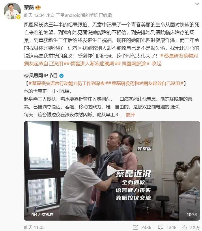 9月25日晚,蔡磊在社媒发文:看到了大家很关切我的现状,确实现在五体瘫软无法言语,压痛、口水、呛咳、吞咽、憋气每天都在折磨,但我还有眼睛和耳朵,请大家放心,我每天依然在带领团队,科研、运营、合作、人事、财务等等大量工作我每天依然通过眼控在高效处理。