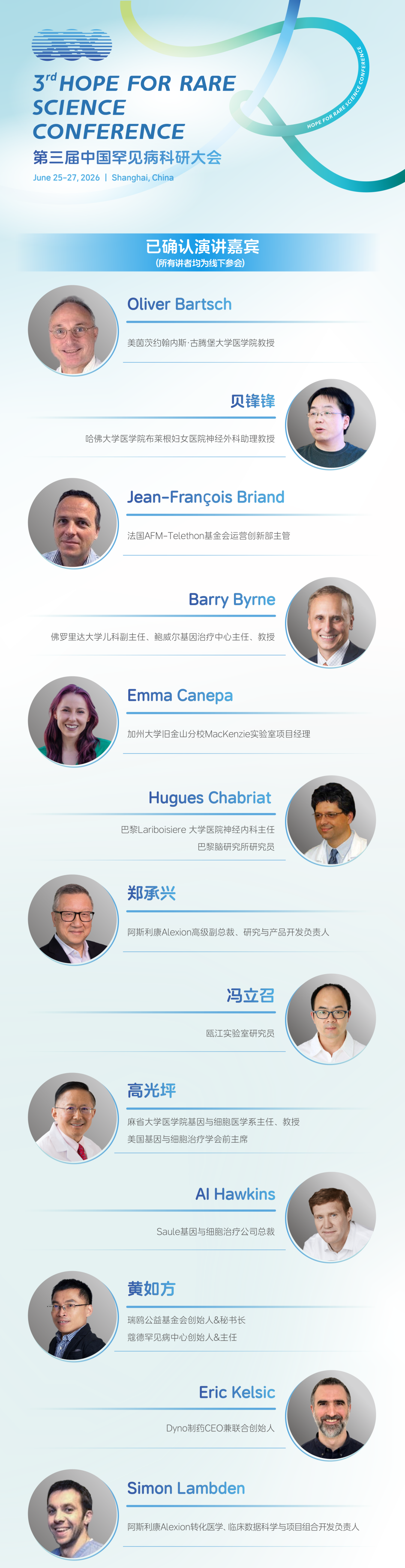 这是一次思想的集结,更是一次行动的宣言。众多科研先锋将带着他们最前沿的研究和最深刻的洞察齐聚一堂,用智慧连接过去与未来,用创新回应生命的托付。无论你是研究者、临床医生,还是关注这一领域的同行者,诚邀你共同见证:当科研的火种汇聚,“罕见”终将迸发出“不凡”的光芒。在第19个国际罕见病日到来之际,我们正式公布本届科研大会的首批讲者名单!