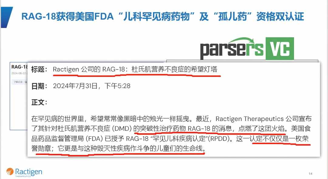 DMD 因抗肌萎缩蛋白基因缺陷导致肌肉持续损伤,传统疗法仅能覆盖 10% 患者。RAG-18 通过 saRNA 激活内源性 Utrophin 蛋白(功能类似抗肌萎缩蛋白),实现 100% 患者覆盖。临床前数据显示,其可显著上调骨骼肌和心肌中 Utrophin 表达,减轻肌肉损伤,改善运动功能。该药物获 FDA “儿科罕见病” 和 “孤儿药” 双认证,预计 2025 年第四季度提交美国 IND 申请。