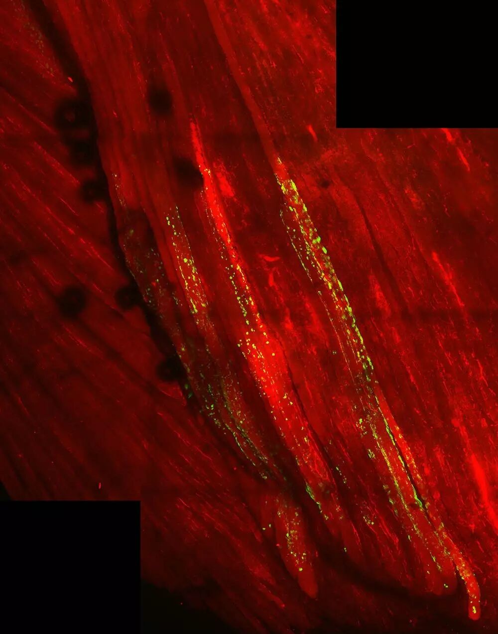 红色的肌肉纤维和绿色的TDP-43聚集。