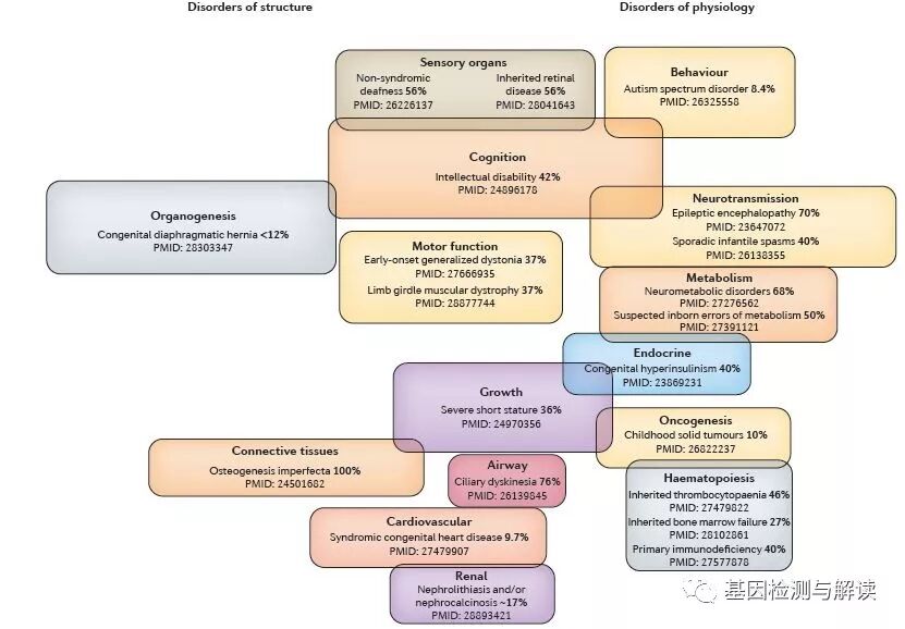 图1. 儿科基因组疾病类别中基于全外显子测序方法的诊断率。各类疾病表型分别标注了基于全外显子测序方法的诊断率以及相关的PubMed识别号(PMID);仅病例数≥10的案例被采用,并且仅包括可能或已知疾病基因中的致病性或可能致病性的变异体。除了神经发育障碍类疾病外,许多广泛的疾病类别的研究文献很少。盒型图大小与儿科实践中该表型的出现频率近似成比例(点击图片可放大)。