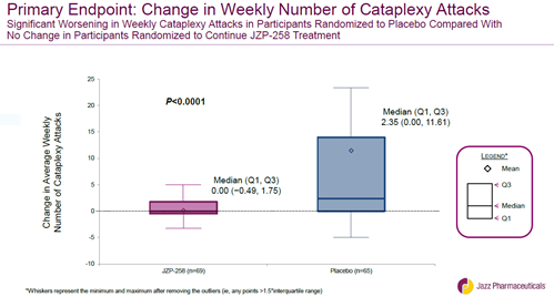 ▲继续接受Xywav治疗的患者每周猝倒发作的次数显著少于安慰剂组(图片来源:Jazz Pharmaceuticals官网)