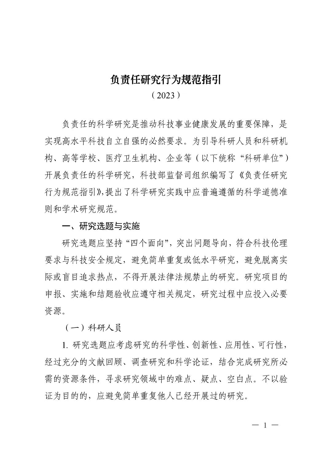 1. 《负责任研究行为规范指引(2023)》2. 关于《负责任研究行为规范指引(2023)》的解读