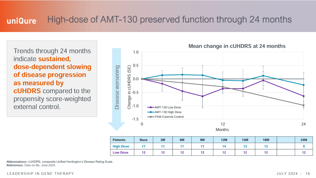 临床疗效显著:去年公布的24个月随访数据显示,接受高剂量治疗的患者疾病进展减缓80%(基于cUHDRS评分),低剂量组减缓30%。此外,患者脑脊液中的神经丝轻链(NfL,神经退行性标志物)水平平均下降11%。