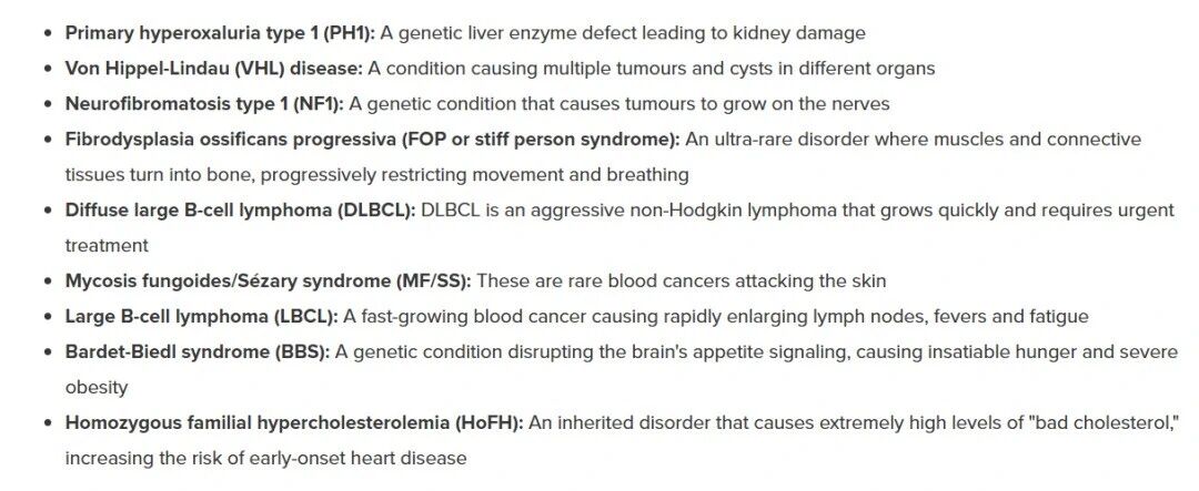 它们分别对应多种严重罕见病的治疗需求,具体包括: