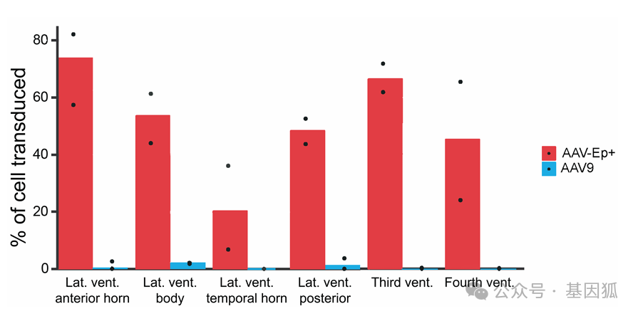 ▲ AAV-Ep+与AAV9在非洲绿猴室管膜细胞中的转导效率