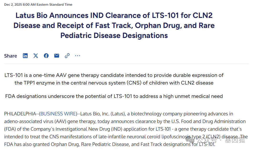打破传统:从“频繁输注”到“一次性治愈”近日,Latus Bio公司宣布其基于新型衣壳AAV.Ep+开发的AAV基因疗法LTS-101 (AAV.Ep⁺.TPP1) 获得美国FDA新药临床试验申请 (IND) 批准,旨在通过一次性给药治愈晚期婴儿型神经元蜡样脂褐质沉积症2型 (CLN2)。此外,LTS-101还获得了FDA授予的快速通道资格认定 (FTD)、孤儿药资格认定 (ODD) 和罕见儿科疾病资格认定 (RPDD)。