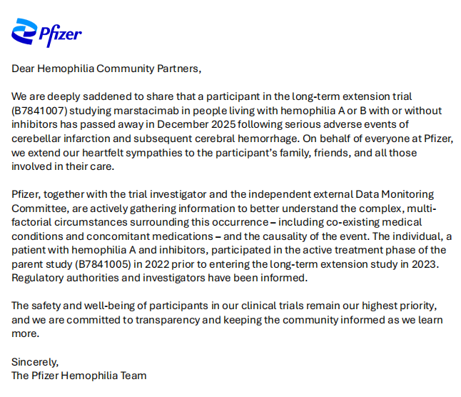 据悉,该患者是2022年首批加入III期研究的受试者,2023年转入扩展试验阶段,在此期间持续接受Hympavzi预防性治疗,且在小型手术后会联合使用重组因子VIIa预防出血,截至本次致命事件发生前,已接受每周一次的Hympavzi预防性治疗长达三年。此次患者死亡源于小脑梗死、脑出血等严重不良事件,与辉瑞此前致患者群体信函中披露的情况一致,具体死因仍有待进一步调查。事件发生后,辉瑞已迅速联合研究者及独立数据监测委员会启动审查,并同步通知监管机构。