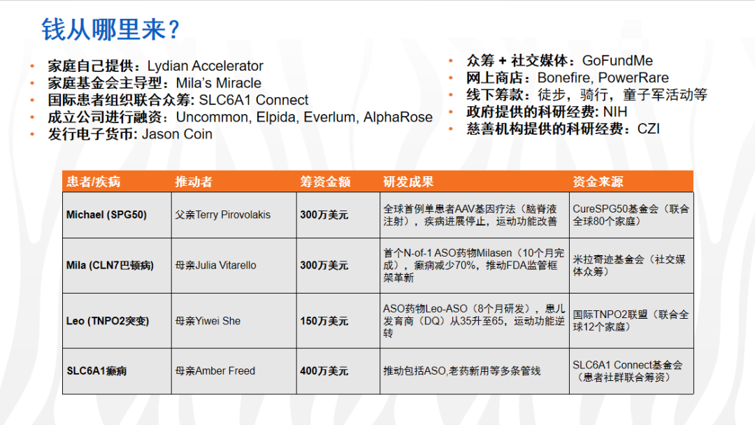 家庭与社群自筹:SLC6A1 癫痫患者母亲 Amber Freed 联合全球家庭众筹 400 万美元,推动 ASO 及老药新用管线;Michael 家庭通过基金会整合 80 个家庭资源,募集 300 万美元。