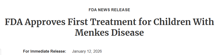 2026年1月12日,美国食品药品监督管理局(FDA)宣布批准Zycubo(组氨酸铜,copper histidinate)注射液上市,这是FDA批准的首款用于治疗儿科患者Menkes病(Menkes disease)的药物。此次批准,为这一罕见且致命的神经退行性疾病患者带来了首个获批的治疗选择,也让无数深陷绝望的患者家庭看到了希望的曙光。