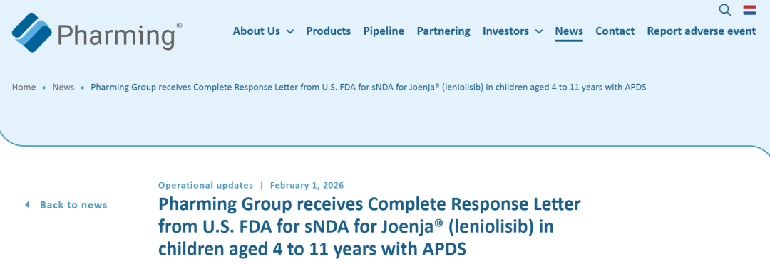 昨天,生物制药公司Pharming Group宣布,美国食品药品监督管理局(FDA)已正式拒绝其核心药物Joenja®(leniolisib)的补充新药申请(sNDA),并通过完整回应函(CRL)明确了驳回理由。此次申请的核心目标,是将Joenja的适用人群拓展至4至11岁的活化磷酸肌醇3-激酶δ综合征(APDS)儿童患者——该病属于罕见原发性免疫缺陷病,目前全球范围内该年龄段尚无获批的靶向治疗方案。值得注意的是,FDA曾于2025年10月授予该申请优先审评资格,认可其有望为这类重症患者的治疗带来显著改善。