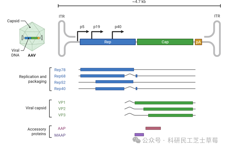 ②AAV 的核心结构是一条约 4.7kb 的单链 DNA,外面包着一层 20-25nm 的 “外壳”(二十面体衣壳,无包膜)。