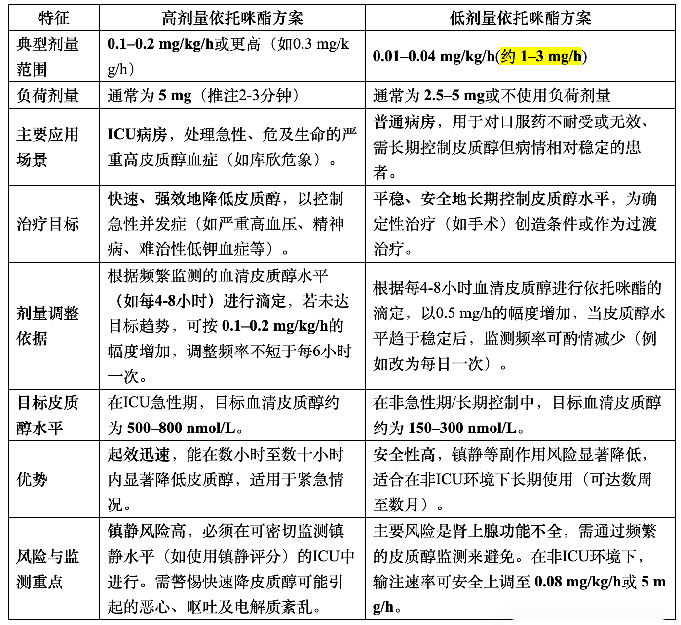 低剂量方案:对于非ICU或病情相对稳定者,0.02–0.04 mg/kg/h(或2-3 mg/h)(平均0.025 mg/kg/h)亦可有效控制皮质醇,且无需ICU监护, 输注速率可以安全地上调至0.08 mg/kg/h 和5 mg/h。