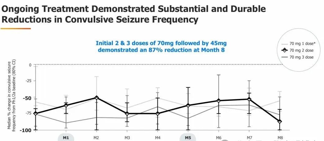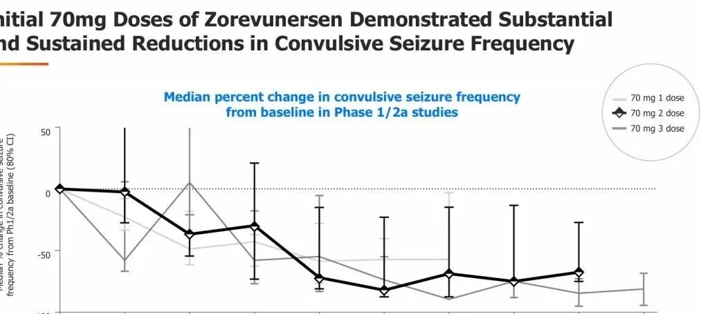 在 1/2a 期研究中,接受 2-3 剂 70mg Zorevunersen 治疗的患儿,3 个月时癫痫发作频率平均下降 85%,停药后 6 个月仍保持 74% 的降幅;而在长达 3 年的开放标签扩展研究中,接受 70mg 负荷剂量 + 45mg 维持剂量的患儿,癫痫发作频率最高下降 91%,且这种控制效果具有持续性,远优于传统抗癫痫药物。
