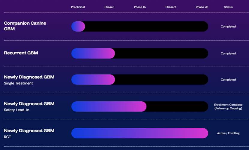 此次启动的IIb期多中心、随机、双盲、安慰剂对照试验,是验证该疗法临床价值的关键一步。研究计划入组超100名患者,覆盖欧美15个神经肿瘤中心,入组人群严格限定为已完成手术与标准放化疗的新诊断胶质母细胞瘤患者,研究设计更贴近真实临床场景。主要终点无进展生存期 (PFS) 是胶质母细胞瘤临床疗效的核心评价指标,关键次要终点总生存期 (OS) 则直接关联患者最终获益,同时全面评估安全性与耐受性,可为该疗法纳入临床指南提供坚实依据。
