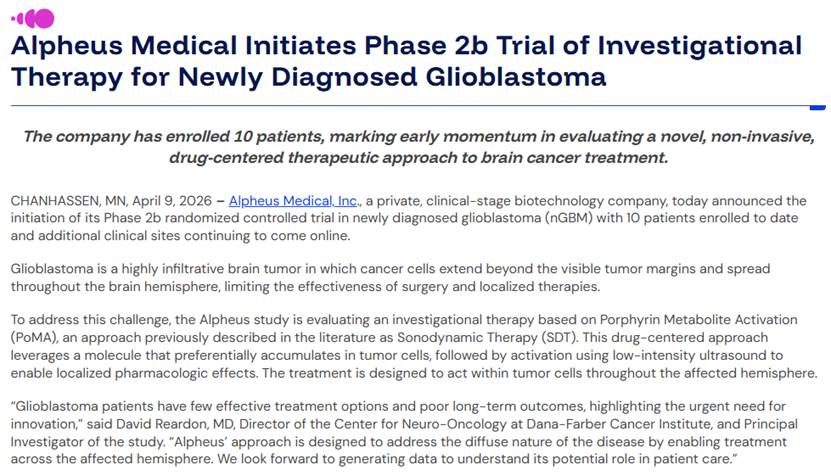 近日,Alpheus Medical公司宣布,其用于治疗成人新诊断胶质母细胞瘤的卟啉代谢物激活技术 (PoMA) 创新疗法正式启动IIb期关键临床试验并已完成10例患者入组。作为一种以药物为核心、结合超声激活的非侵入性治疗手段,该疗法跳出传统局部治疗局限,直指胶质母细胞瘤核心病理特征,有望为这一极危重恶性肿瘤带来全新治疗希望。