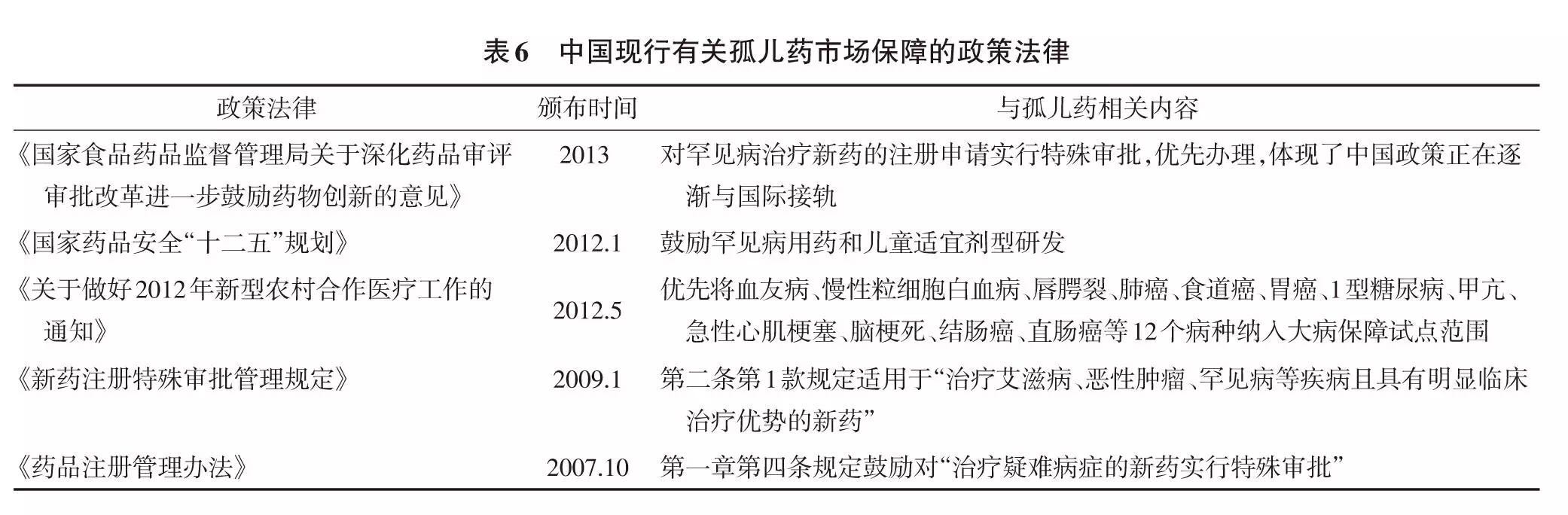 中国目前尚没有专门的孤儿药法律,有关孤儿药市场保障政策零散分布在其他政策法律中,尚未形成体系(表6)。中国尚处于创新转型期,新药研发能力相当薄弱,而孤儿药的市场狭窄性,极大限制了国内孤儿药开发, 中国孤儿药自主研制市场几近空白,主要依赖进口。目前中国已上市的孤儿药约145种,远远不能满足罕见病的治疗需求。