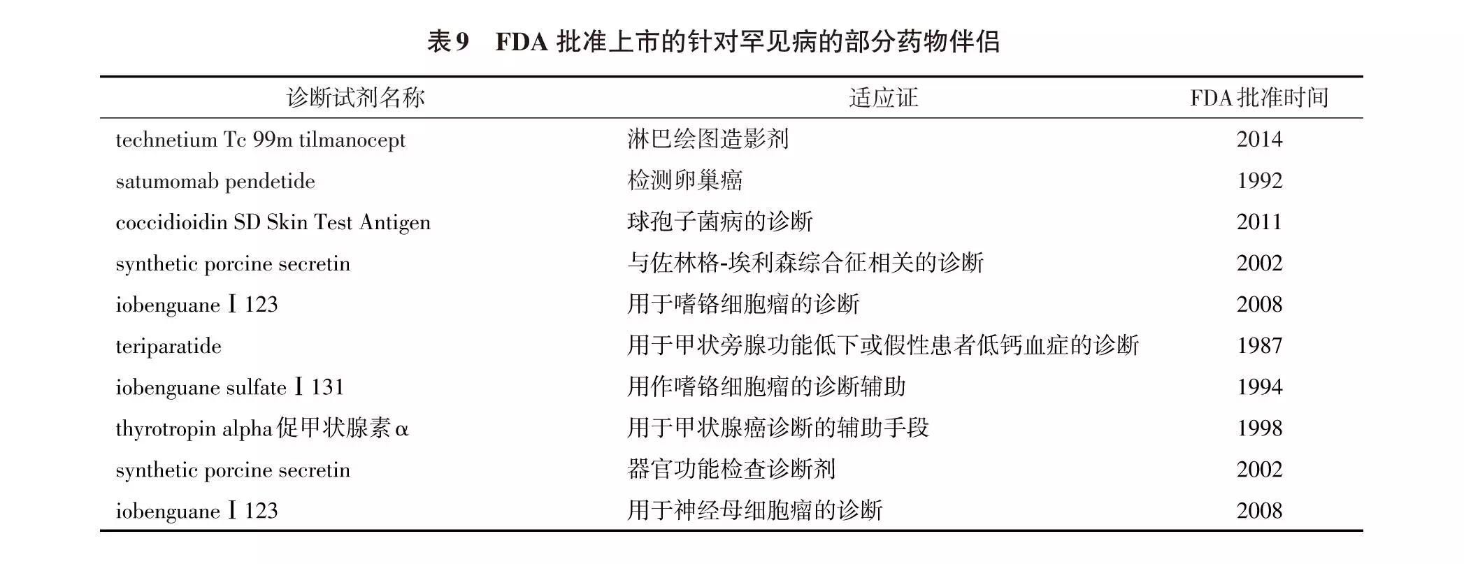 4. 2. 2 与诊断罕见病关联的药物伴侣 与罕见病关联的诊断试剂对孤儿药开发非常关键,应在品种开发时予以关注和匹配研发。表9 为FDA 批准上市的针对罕见病的药物伴侣。遗传基因缺陷所致的罕见病多有复杂的系统性症状,临床试验治疗终点往往难以确定,而生物标志物可提供有效的早期替代终点。生物标志物对于药物应答的诊断可被开发成药物的伴随诊断试剂,除用于检测药物的疗效还可预测药物在特定患者的治疗作用。