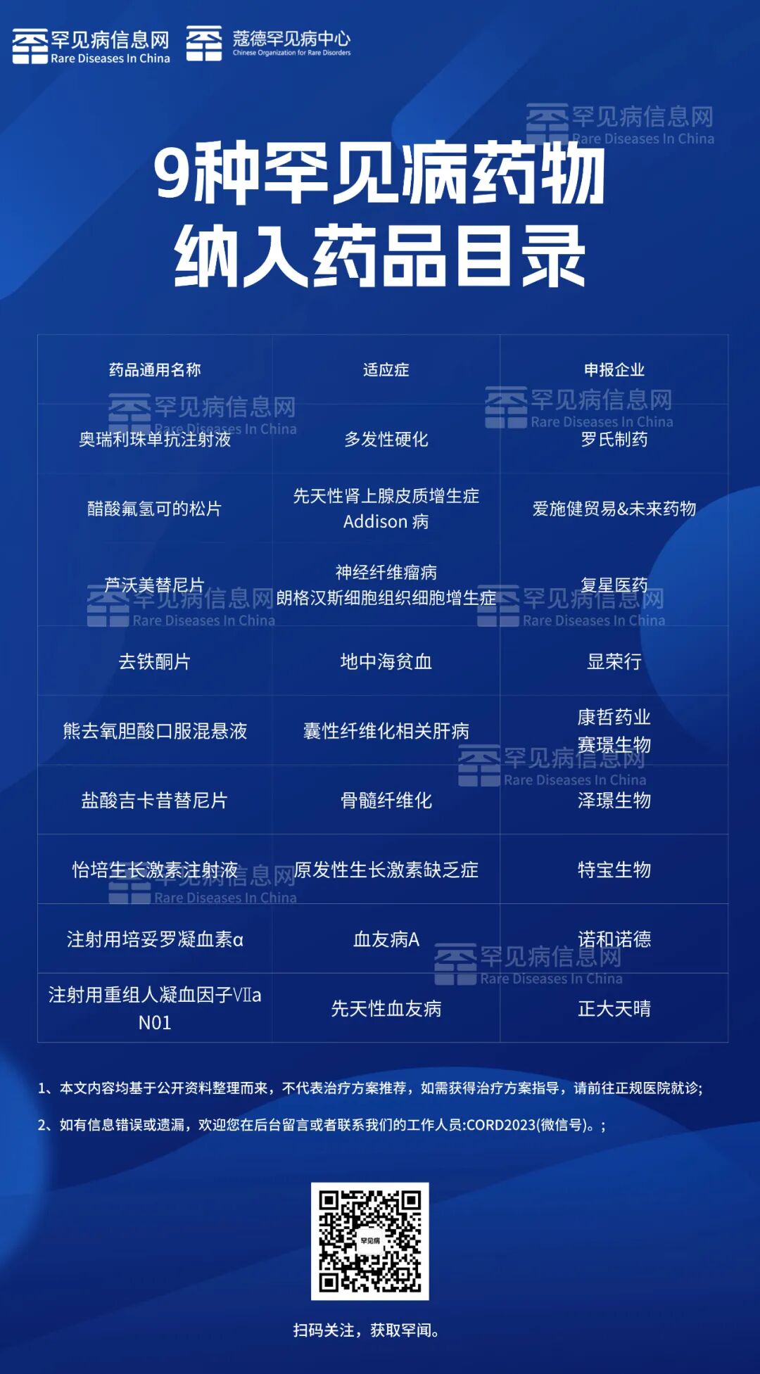 据罕见病信息网不完全统计,有 9 种罕见病药物被纳入本次医保目录,覆盖朗格汉斯细胞组织细胞增生症、螯合剂不耐受的地中海贫血症等10种罕见病的用药需求。