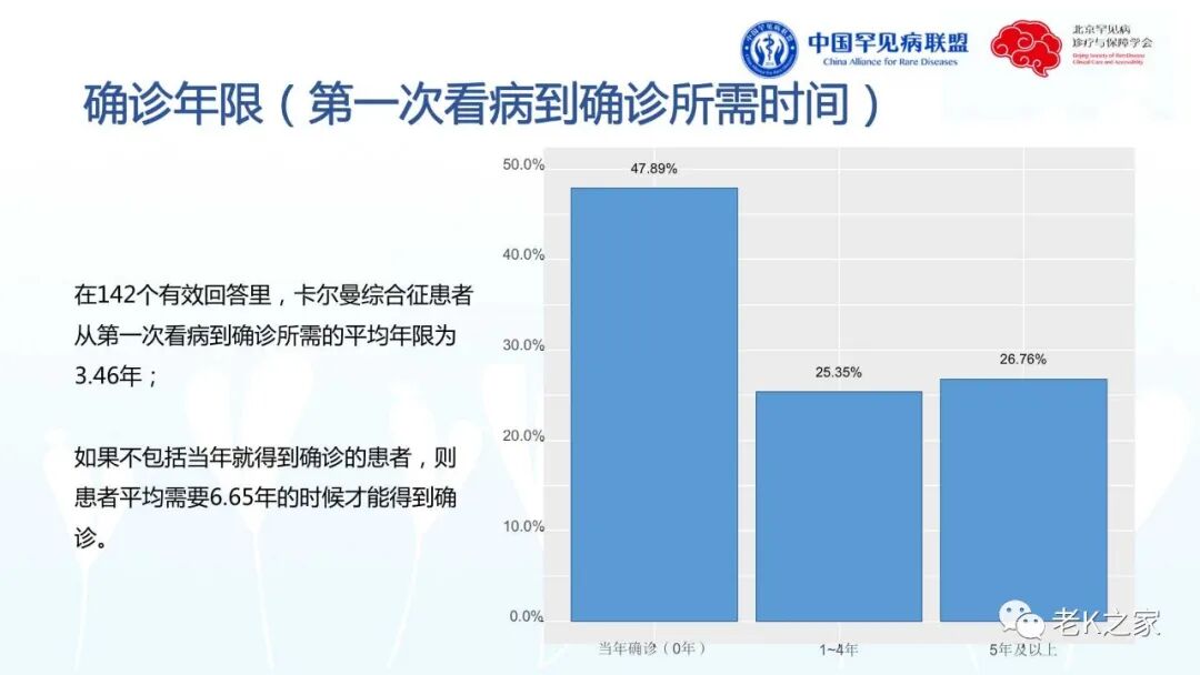 在142个有效回答里,卡尔曼氏综合征患者从第一次看病到确诊所需的平均年限为3.46年;
