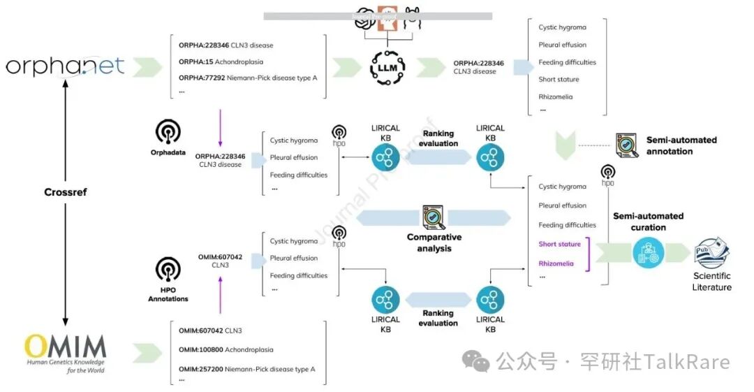 研究人员将模型输出结果标准化映射至 HPO 术语集,并与源自 Orphanet 数据库及人类表型本体注释库(HPOA)的疾病 - 表型关联数据进行比对。同时,从 PubMed 摘要中提取相关证据,为新发现的疾病 - 表型关联关系提供支撑。