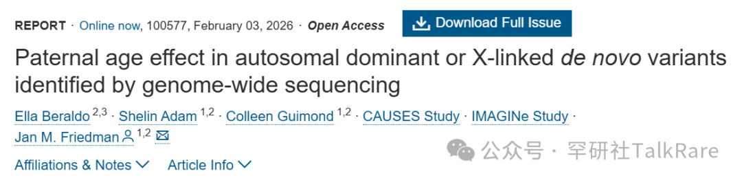 题目:全基因组测序鉴定的常染色体显性或 X 连锁新发变异中的父龄效应 作者:Ella Beraldo, 等