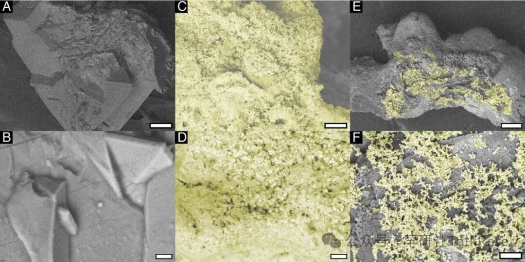 图:肾结石内发现的细菌生物膜成分(黄色为假色)。(施密特等人,PNAS,2026 年)