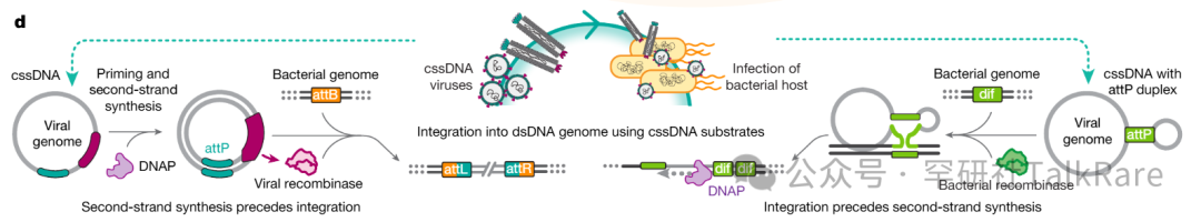 图:携带 cssDNA 基因组的病毒整合生命周期:在宿主 DNA 聚合酶(DNAP)对其基因组完成第二条链合成之前或之后,病毒利用自身编码或宿主编码的重组酶实现基因组整合。