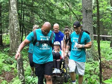 地形非常不规则,他们几乎没有可以把Gambill的轮椅推到平地上的时候。他们开发了一种系统,两三个人可以举起她和她的轮椅——大约170磅——与此同时其他队友则可以休息。