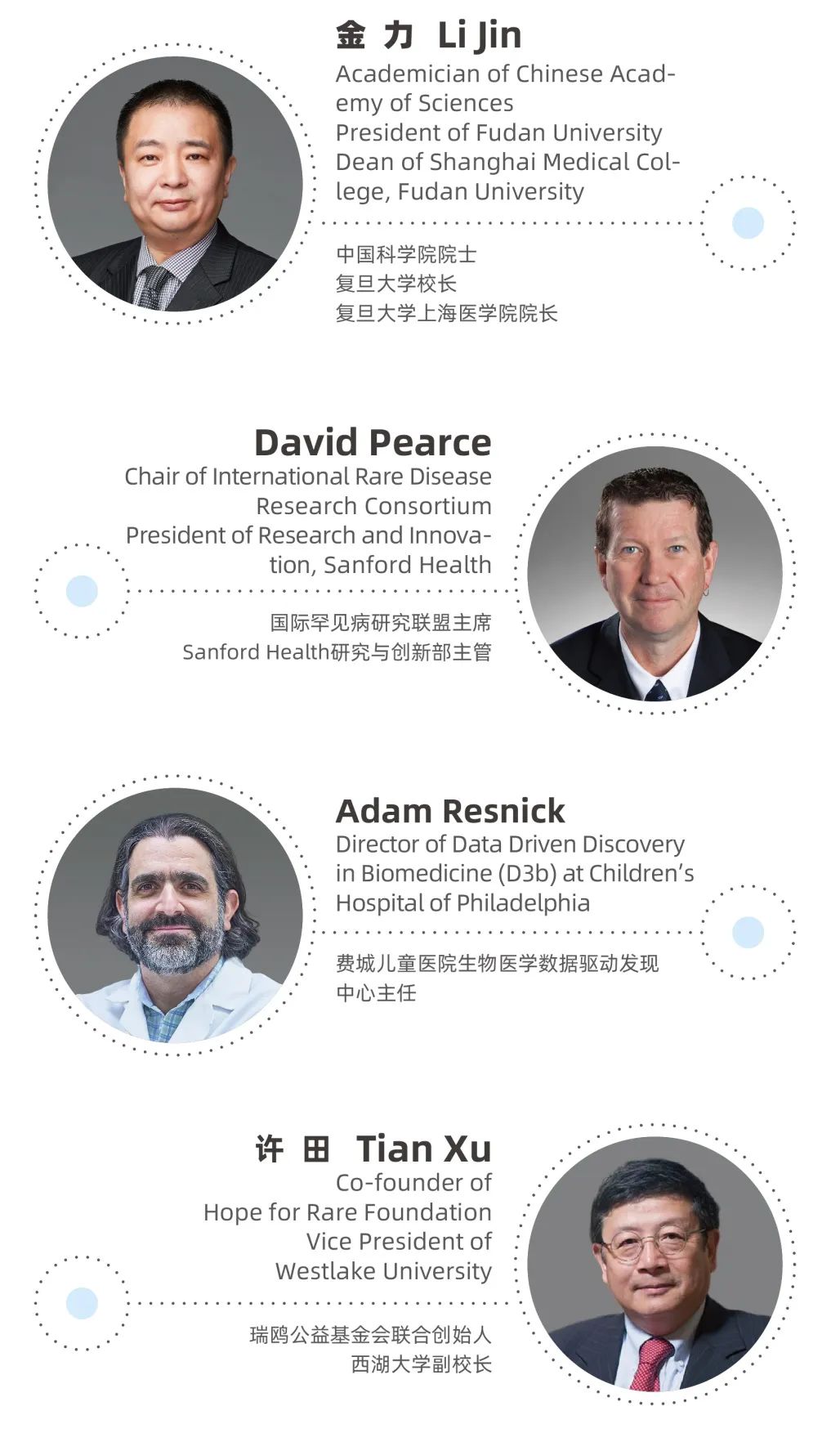 中国科学院院士、复旦大学校长、复旦大学上海医学院院长金力,国际罕见病研究联盟主席、Sanford Health研究与创新部主管David Pearce,费城儿童医院生物医学数据驱动发现中心主任Adam Resnick,瑞鸥公益基金会联合创始人、西湖大学副校长许田共同担任大会主席。届时,他们将在上海浦东欢迎全球科研同仁,共话罕见病科研与转化医学。
