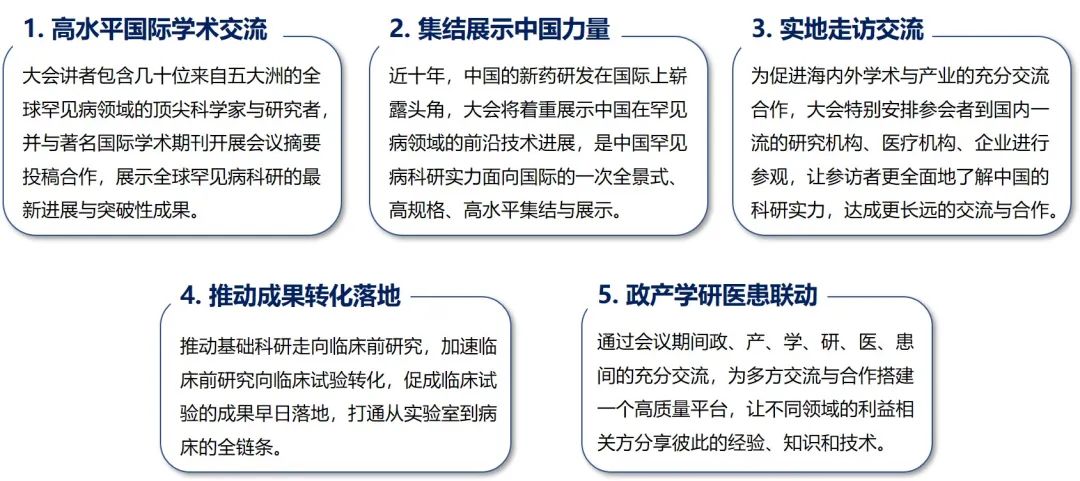 本次大会会期两天半,将邀请百余位来自国内外高校、医院、科研院所及医药企业从事罕见病基础与转化医学研究的专家学者,以“罕见病科研”为纽带,通过对话交流,共同探讨罕见病科研难题,旨在促进罕见病领域国际学术交流,共建国内外罕见病科研与转化医学多方交流的一体化合作促进平台。