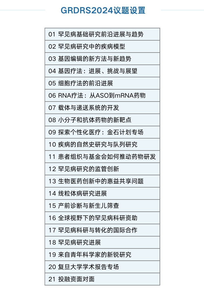 本次大会聚焦“基础研究-临床应用-转化医学-成果落地”全链条的罕见病药物研发路径,设置了21场专题会议。
