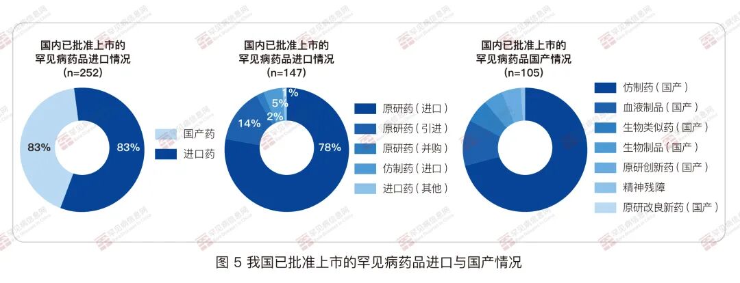 然而,比欧美市场,我国罕见病产业发展较晚,仍处于起步阶段,目前尚未形成一定的规模。 从狭义的医药产业来看,目前仍以进口为主,本土创新极其缺乏。根据蔻德罕见病中心整理的数据,以卫健委等部委颁布的两批罕见病目录为界定依据,我国已获批上市的罕见病药品约252种(非新分子实体,包含仿制药),这其中,接近六成为进口药。在147种进口药中, 近九成为原研创新药,只有极个别为进口仿制药。而在105种国产药品中,绝大多数为仿制药或生物类似药,只有1个改良新药、5个1.1类创新药。