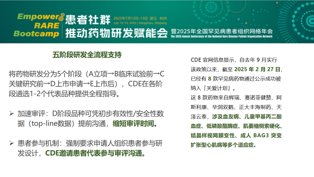 报告的亮点之一是政策法规的更新,这个报告对于近年来中国出台与罕见病相关政策法规进行了全面的梳理和更新。《以患者为中心的罕见病药物研发试点计划(关爱计划)》大概的思路就是将药物研发分为五个阶段,首先是立项,再是临床试验前,关键研究前,上市申请,上市后,CDE在各个阶段会遴选1~2个代表品种提供全程指导,会凭初步的有效性/安全性的数据去跟企业做提前的沟通交流。去年9月实行该政策以来到今年2月份已经有8款罕见病药物通过公示成功纳入“关爱计划”,有来自于辉瑞、赛诺菲、阿斯利康、华润、正大、天泽云泰,涉及的一些罕见疾病包括血友病、儿童甲基丙二酸血症、低磷酸酯酶症等等多个适应症。
