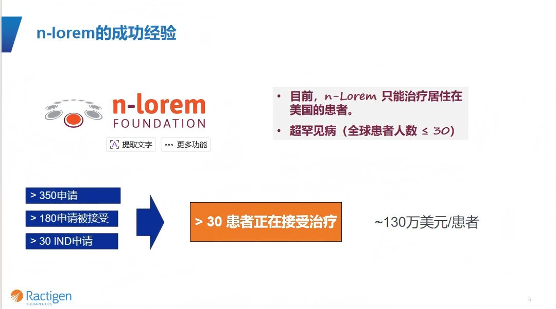 非营利组织 n-Lorem 基金会成为标杆,为全球患者数≤30 人的超罕见病提供免费 ASO 治疗。截至 2025 年,该机构接收 350 份申请,180 项进入开发,30 余例完成 IND 申报并给药,单例成本约 130 万美元,从设计到用药周期仅 15-18 个月。