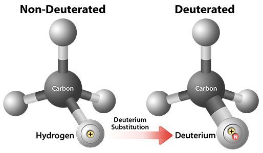 氘(D)元素在自然界中的含量非常丰富,可与其他元素形成稳定的分子键。在一个成年人体内,D的平均含有量约为2g。虽然D与氢(H)在原子大小和形状上基本一致,但D与H也存在根本不同之处,即D含有一个额外的中子。其结果是,D与碳(C)形成的化学键比H与C形成的化学键具有更高的稳定。通常,D-C化学键的稳定性比H-C化学键高出6-9倍,这在药物开发方面具有非常重要的影响,因为药物代谢往往涉及到H-C化学键的断裂。