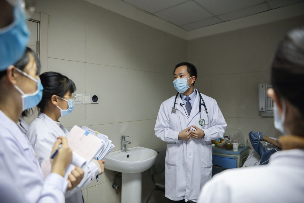 甘肃省人民医院心内二科副主任曹云山(中)在病房内指导学生(1月13日摄)。新华社记者 马希平 摄