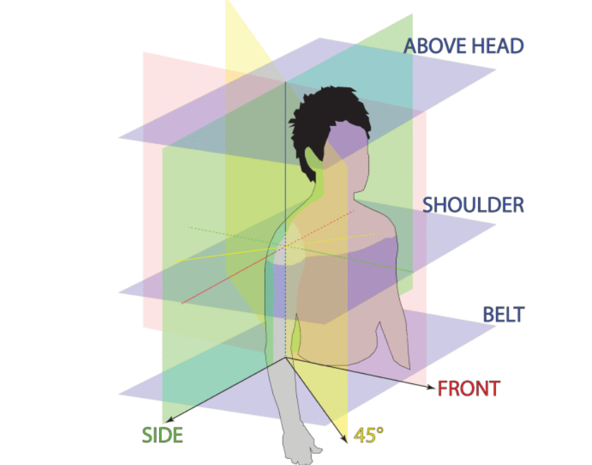 可达工作区 (RW):每个手臂的可达工作空间测量与坐姿分开执行。受试者被要求用他们伸出的手臂在几个运动平面上移动。手腕相对于肩中心的运动被投影到一个异速缩放的球体上。投影面积用作肩部功能的定量测量。