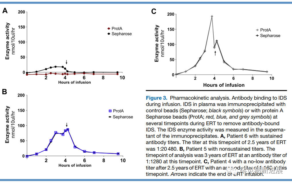 在抗体滴度水平变化的三种类型中,各选择1例患者进行了药代动力学分析。如图3-A所示,代表抗体水平稳定居高类型的患者6,在接受ERT治疗的3小时后IDS活性达峰值水平。如图3-B,代表的抗体水平不稳定型的患者5,在不同抗体水平下基本保持稳定的IDS活性,表明在ERT治疗中,疗效可能并未受到抗体的限制;这一情况和始终处于较低抗体水平的患者4,表现一致(图3-C)。以曲线下面积比较,患者6最小,说明其循环抗体结合并抑制了人源重组IDS的疗效。