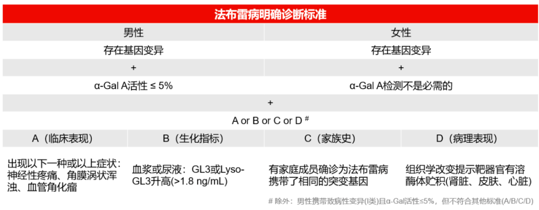 2022年巴西罕见病委员会肾脏病学会发布了法布雷病诊疗的成人和儿童共识,在法布雷病的诊断标准中,明确了男性和女性基于基因变异、酶活性、临床表现/生化/病理/家族史等多项指标的诊断标准。