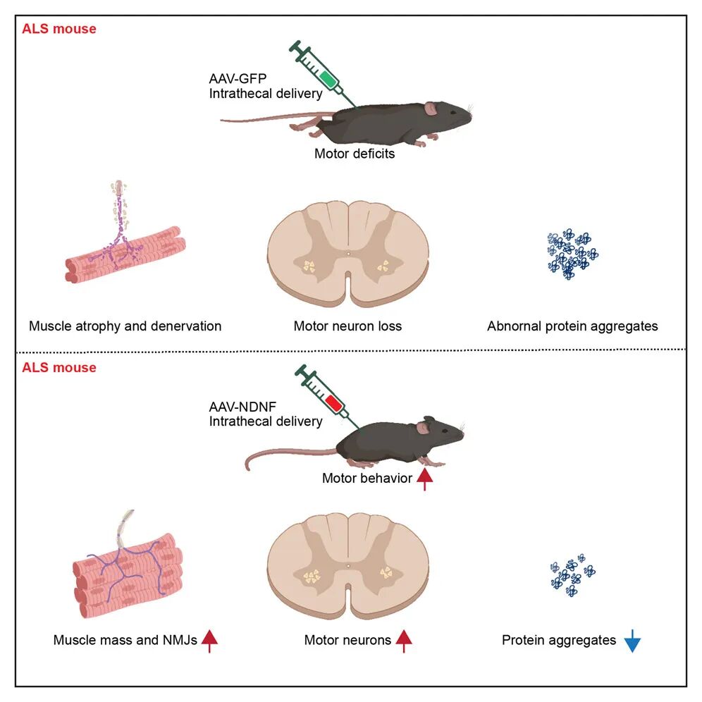 近日,上海科技大学生命科学与技术学院罗振革团队在 Molecular Therapy 期刊发表了题为:Intrathecal delivery of AAV-NDNF ameliorates disease progression of ALS mice(鞘内递送AAV-NDNF可改善ALS小鼠的疾病进展)的研究论文,该研究报道了一种全新的ALS基因治疗策略
