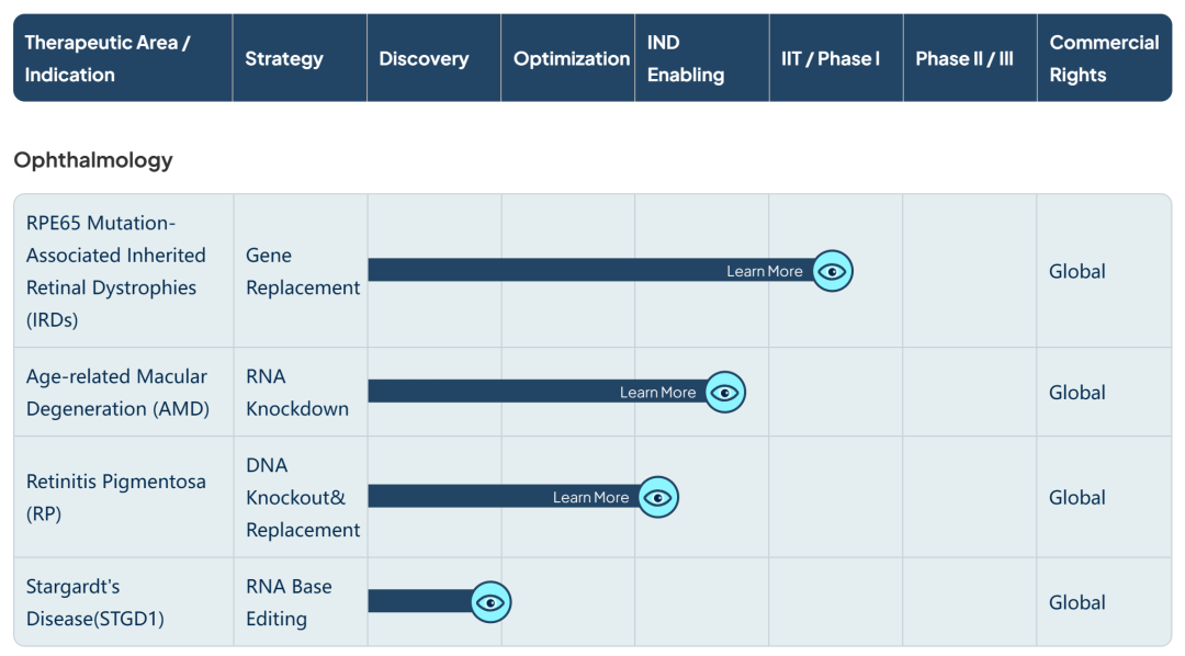 研发管线涵盖眼科、中枢神经等多个领域。公司临床阶段项目包括HG004治疗RPE65突变相关遗传性视网膜疾病(已获得美国FDA授予孤儿药资格认定和儿科罕见病资格认定)和HG202( CRISPR/Cas13 RNA编辑疗法)治疗新生血管性年龄相关性黄斑变性(nAMD)等项目。