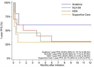 对12例存活者的随访中位数为34.9个月。治疗满一年时,整个队列的PFS为34.8% (95% CI, 18.9%–51.2%);阿那白滞素+HDS、HLH94、HDS和支持性护理组患者对应的PFS分别为63.6%、30%、28.6%和23.1%,(图2)相比支持性护理组的疾病进展风险HR分别为0.33、0.79 和0.71。