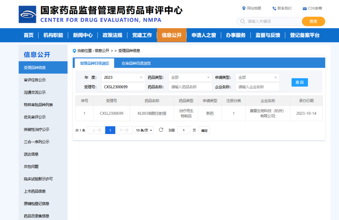 近日,康霖生物提交的具有自主知识产权的旨在治疗输血依赖型β地中海贫血患者的自体造血干细胞产品KL003细胞注射液已于2023年10月14日正式获得药审中心受理(受理号:CXSL2300699)。