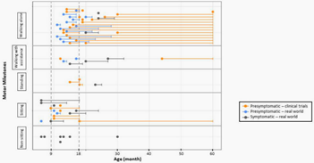 总体分析显示,无论治疗类型如何,患儿的运动发育随SMN2基因拷贝数不同表现出显著的差异。28名携带3个SMN2拷贝的患儿均能独立行走,其中85%(n=24)发育正常,其余患儿(n=4)只有轻度运动迟缓。携带2个SMN2拷贝的33例患者运动发展更具异质性:所有患者均能独坐,但只有23人(70%)实现了9个月前独坐的发育里程碑;23人可独走,但仅12人能在18个月前独走。在整个观察期间,患儿的发育持续进步,甚至部分能持续到5岁。三种药物治疗的总体耐受性良好,无严重不良事件报告。
