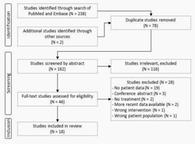 参照PRISMA声明筛选文献,最终共18篇文献被纳入分析,其中13篇为真实世界研究。