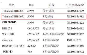 ISIS 333611是靶向SOD1 mRNA的反义管寡核苷酸(ASO),可以降低SOD1-G93A转基因大鼠中SOD1 mRNA和蛋白的表达,具有剂量依赖性,延缓SOD1-G93A转基因大鼠疾病进展,表现出良好的耐受性。1期临床试验表明使用该ASO后患者脑脊液中未发现SOD1蛋白减少,不良反应事件仅是腰椎穿刺后综合征和背痛,证实鞘内注射给药是可行的,为ASO疗法的广泛探索铺平了道路。